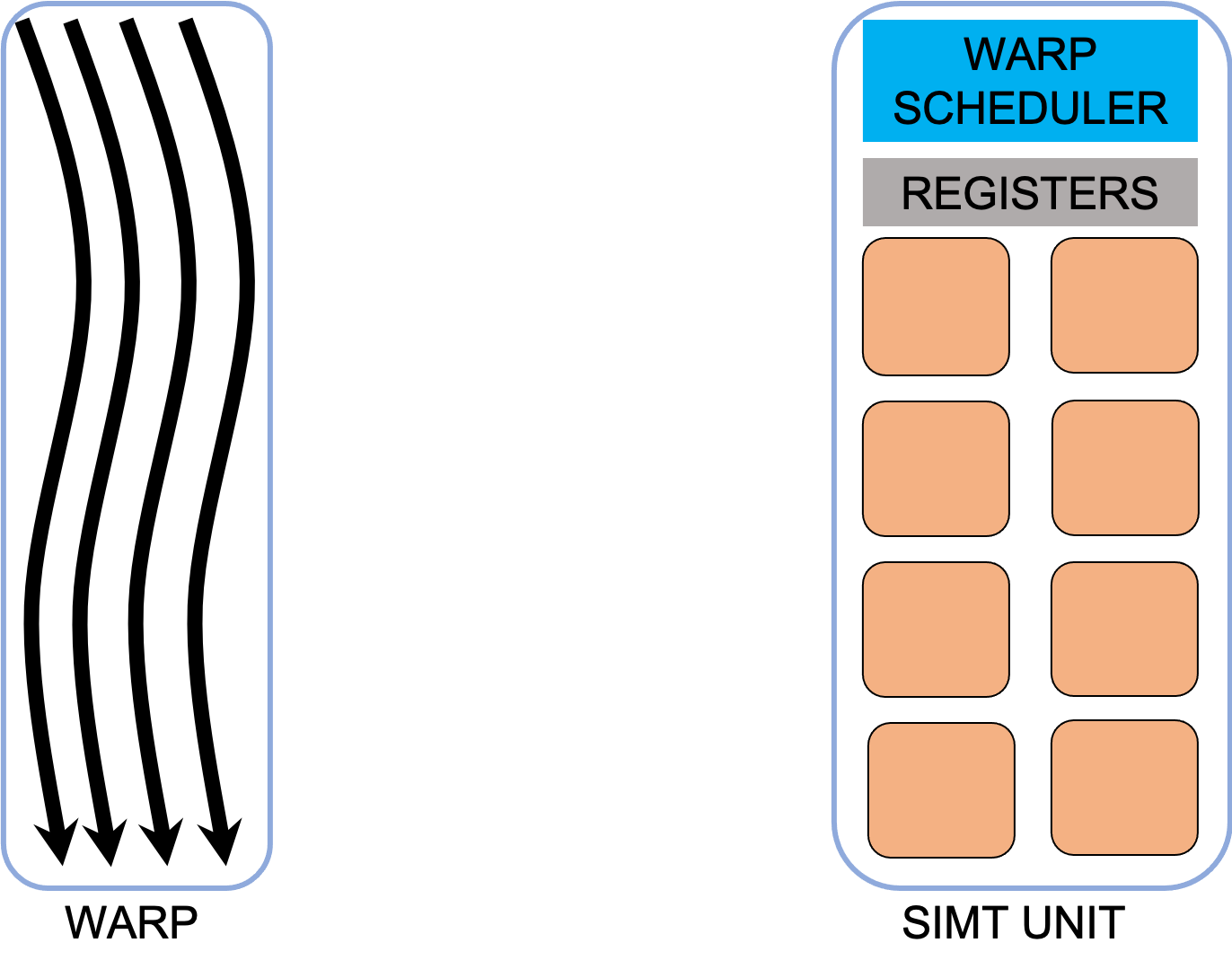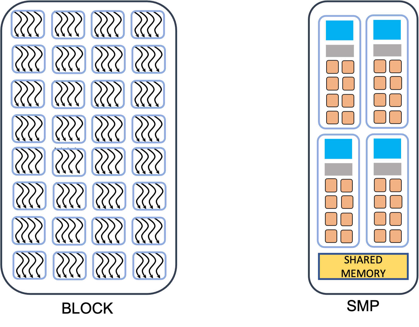 Threads are organized into warps, and warps are grouped into blocks assigned to streaming multiprocessors (SMPs).