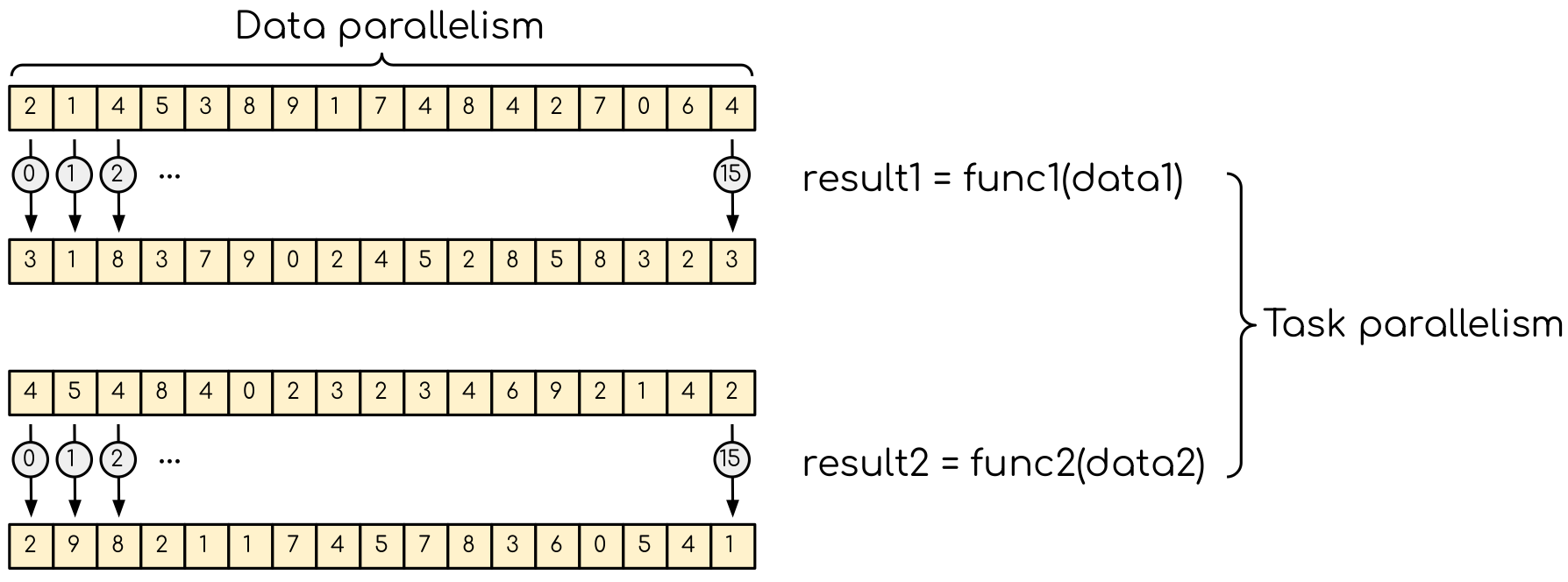 Data parallelism and task parallelism. The data parallelism is when the same operation applies to multiple data (e.g. multiple elements of an array are transformed). The task parallelism implies that there are more than one independent task that, in principle, can be executed in parallel.¶