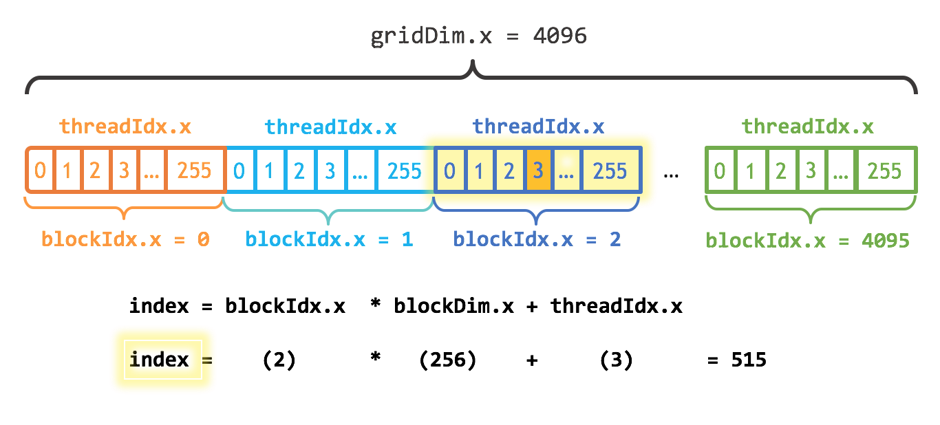 The thread marked by orange color is part of a grid of threads size 4096. The threads are grouped in blocks of size 256. The “orange” thread has index 3 in the block 2 and the global calculated index 515.